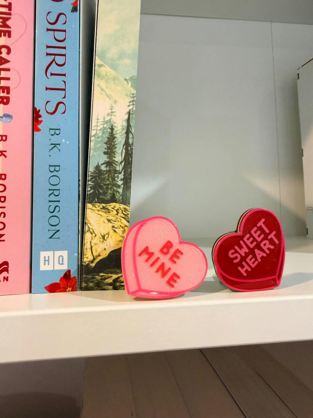 I absolutely loved both candy heart brooches I bought from Erst Wilder. They look so so perfect on my romance book shelves right now. I need the rest! So good.