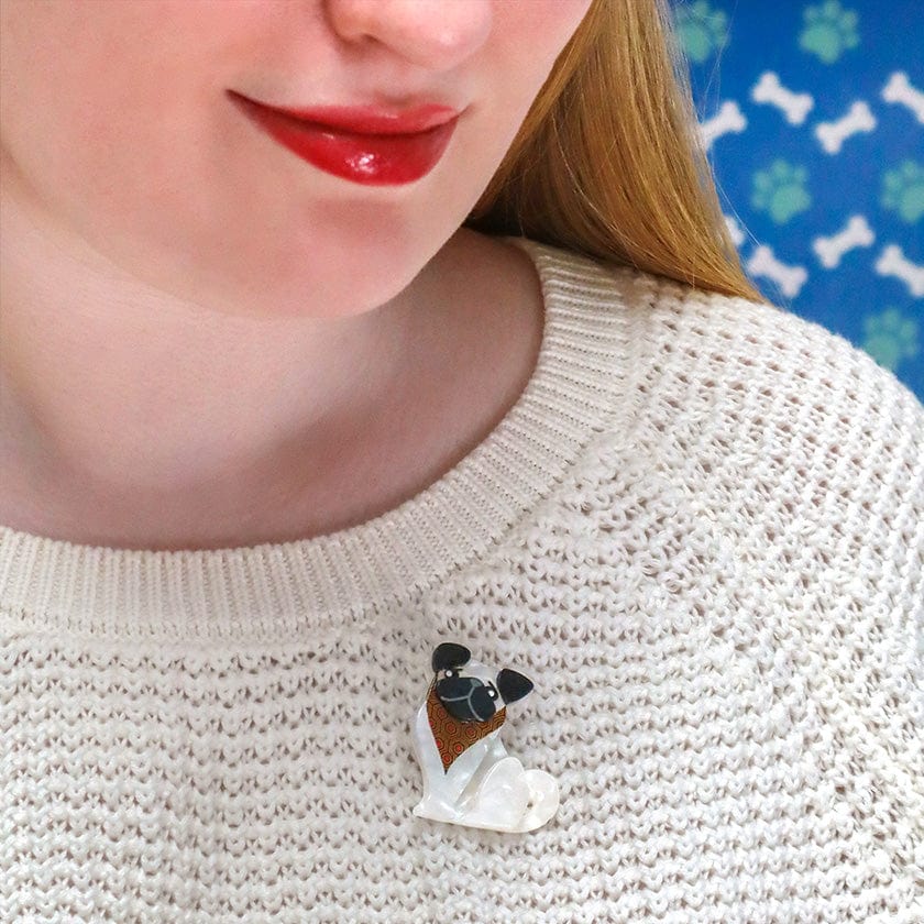 Adoring Polly Pug returns with all of her charm and sporting a brand new scarf, but shrunken down to Erstwilder 'Mini' brooch size. A perfect pooch to complete any outfit, Polly can't wait to play with you! Shop this delightful dog brooch for yourself or make it a meaningful gift for any pug lover in your world. Available strictly while stocks last.