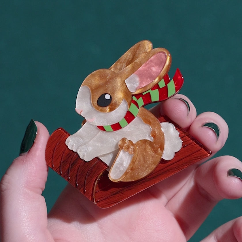 Wrapped in a striped scarf and full of festive cheer, Breezy is ready to glide through the season in style. Hand-assembled from layered resin, her soft caramel tones and woodgrain sled bring warmth and whimsy to any outfit. A limited-run design that captures the joy in every adventure.