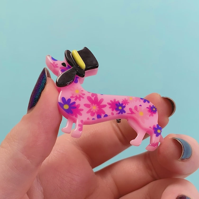 Dapper Dachshund is back! With a vibrant floral print and shrunken down to Erstwilder 'mini' brooch size, this fashionable furry friend can't wait to escort you to all your future events. Shop this delightful dog brooch for yourself or make it a meaningful gift for any sausage dog lover in your world. Available strictly while stocks last.