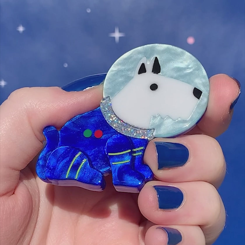 An assortment of awe-inspiring resins bring this hand-assembled white terrier astronaut brooch to life. Part of our Mission to the Moon range of out of this world accessories, Daring Dogmonaut takes design inspiration from 1960s futurism, with some added Erstwilder quirk, and can be worn together with any combination of our Major Tomcat, Stout-Hearted Spaceham or Interplanetary Pug brooches to represent our fearless furry friends.