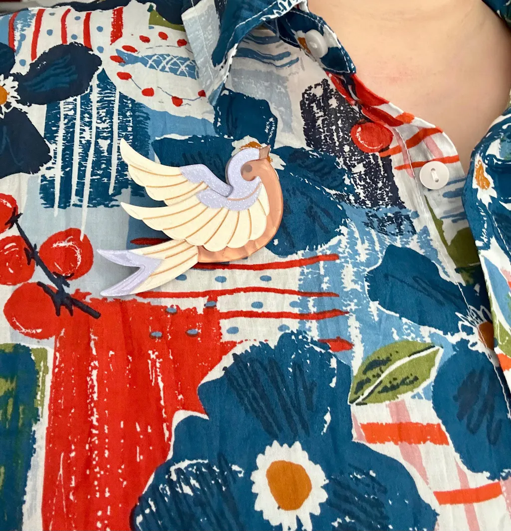 Pretty as ever and back where she belongs. First released in 2013 and last seen in 2021, this marks the eighth edition of Fancy Jo Sparrow, now lovingly updated in caramel, cream and lavender resins with a subtle touch of sparkle. Hand-assembled from layered resin with carefully finished details, the Fancy Jo Sparrow Brooch is a gentle, feel-good favourite, perfect for bird lovers and long-time admirers alike.