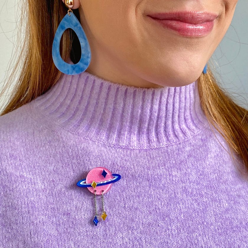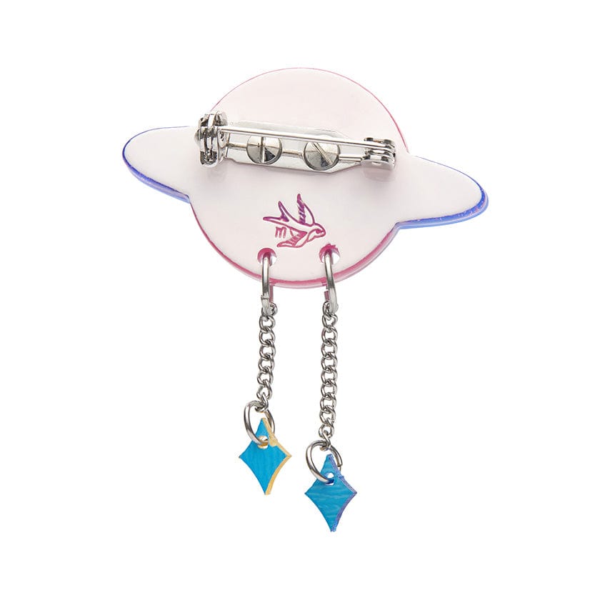 Keep watching the skies with this Saturn-esque planet mini brooch. Hand-assembled from glitter and textured resins and featuring hand-finished details with dazzling silver chain charms, this one is sure to keep you feeling like a star. Adorn any outfit with this pint-sized piece of planetary goodness or double brooch with other minis within the range for a look as unique as you are.