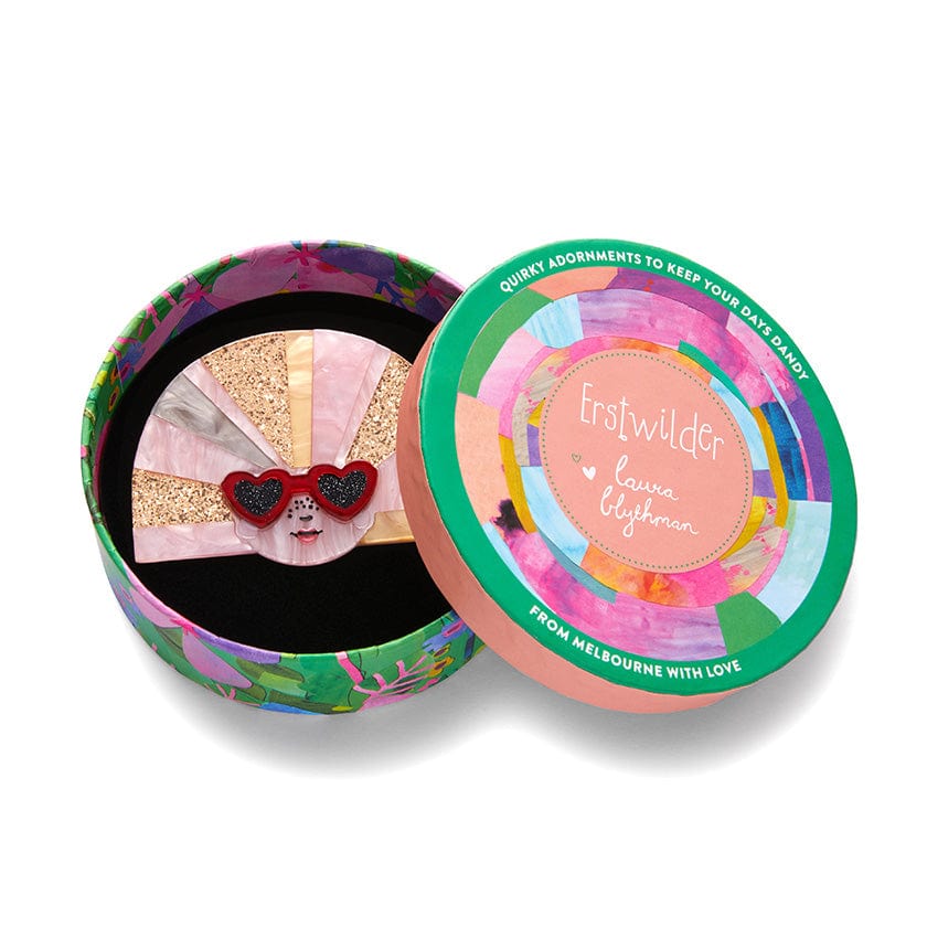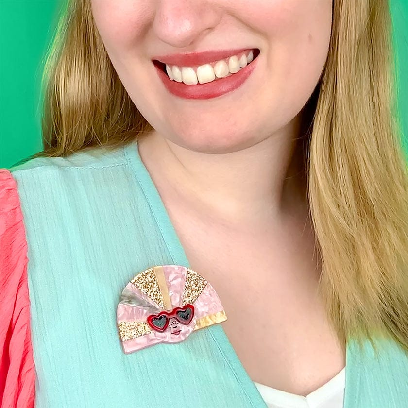A groovy sun brooch to add a slice of cool to your day, this playful Laura Blythman design has been hand assembled from glitter and textured resins. With hand-painted details imbuing it with a warm sense of character, pair this happening art accessory with our Sun Charmer brooch for instant solar power.