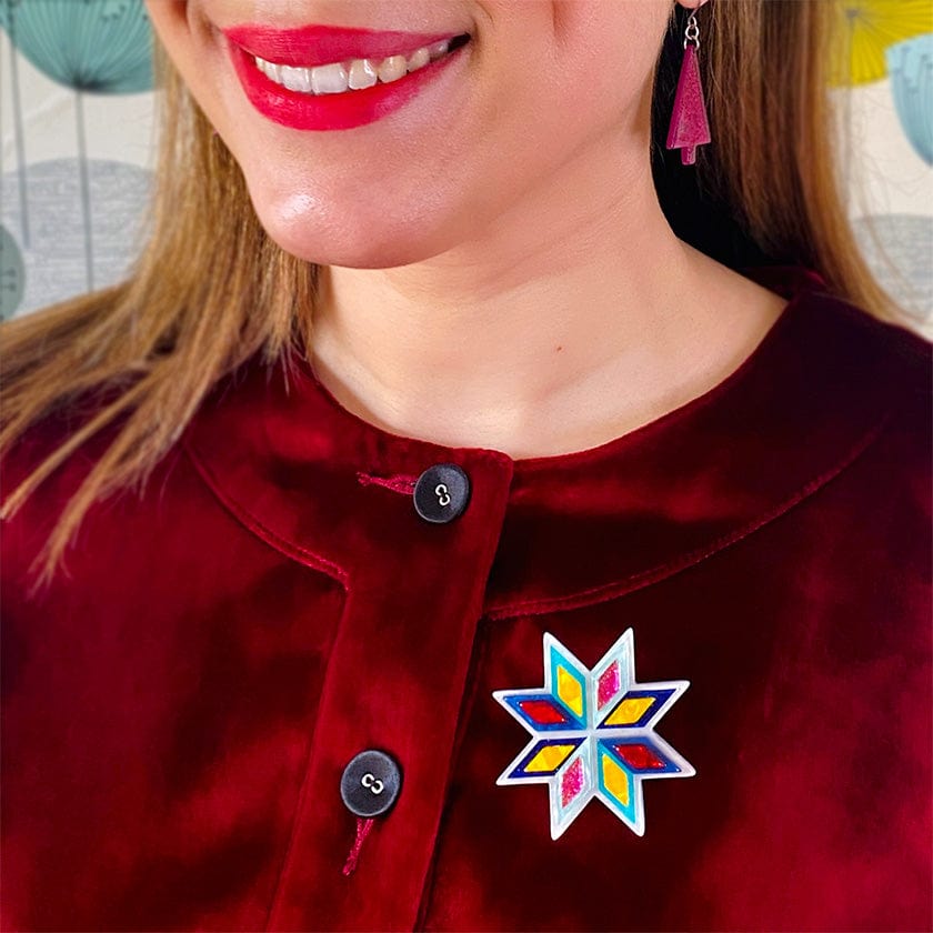 A major seasonal symbol with a mid-century design aesthetic, our Make My Wish Come True brooch has been hand-assembled from a mix of colourful textured and glitter resins for the Modern Holiday accessories collection. Pin it to your favourite festive outfits and be the star of any gathering. Love this design? You'll also discover it available as an enamel pin, and an enamel tree ornament.