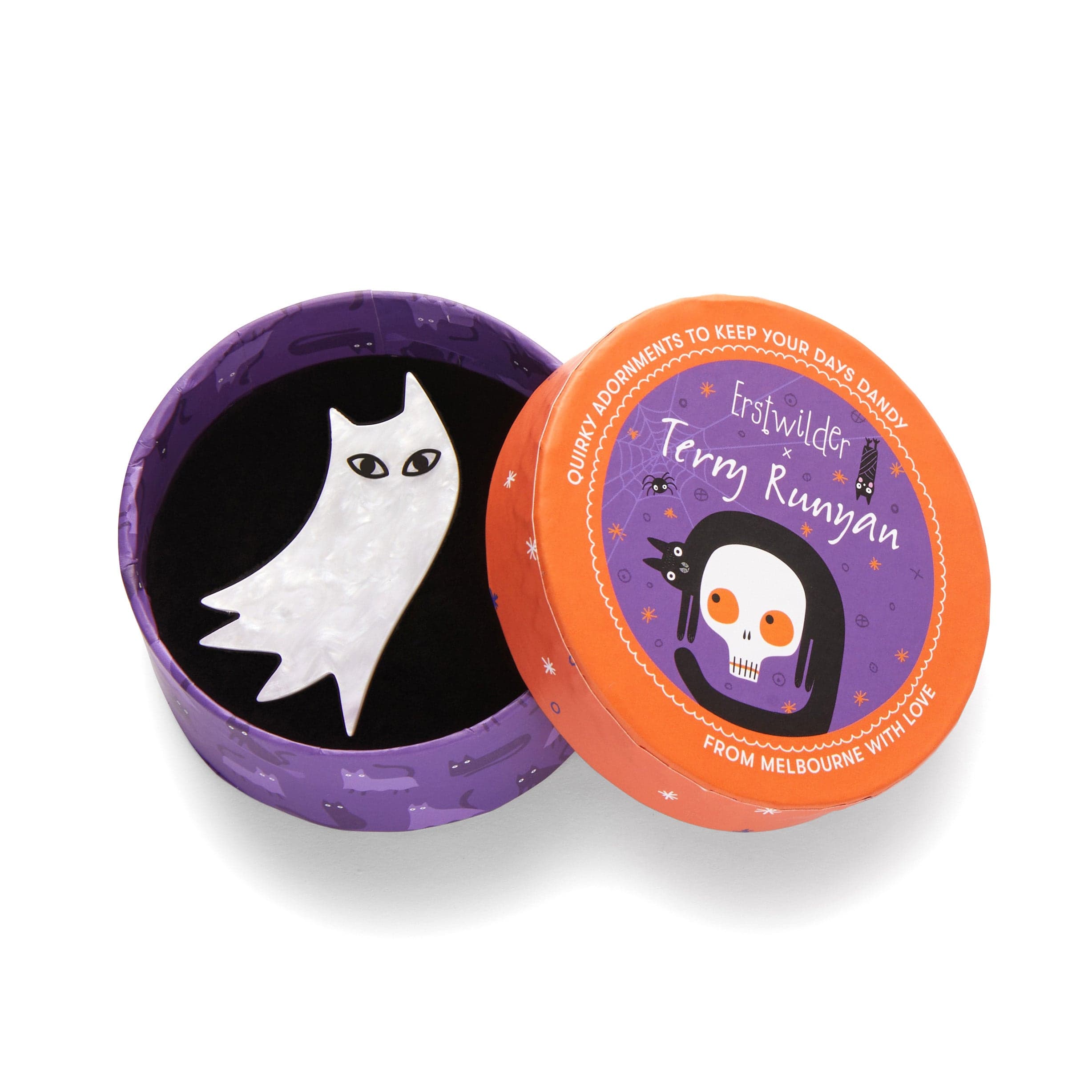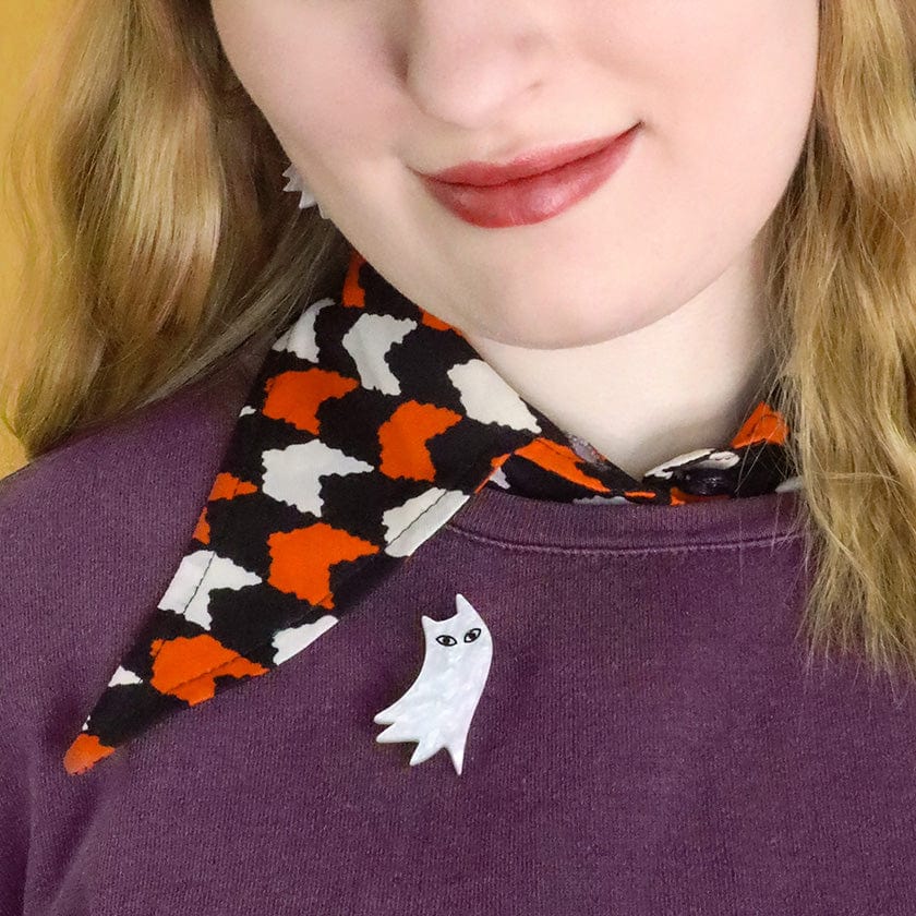 This Erstwilder x Terry Runyan Halloween-themed ghost cat brooch has been crafted from solid resin. With laser-etched details adding just the right amount of quirky character to this wearable art accessory, Nine Afterlives is perfect for some happy Halloween haunting and pairs exceptionally well with its matching drop earrings.