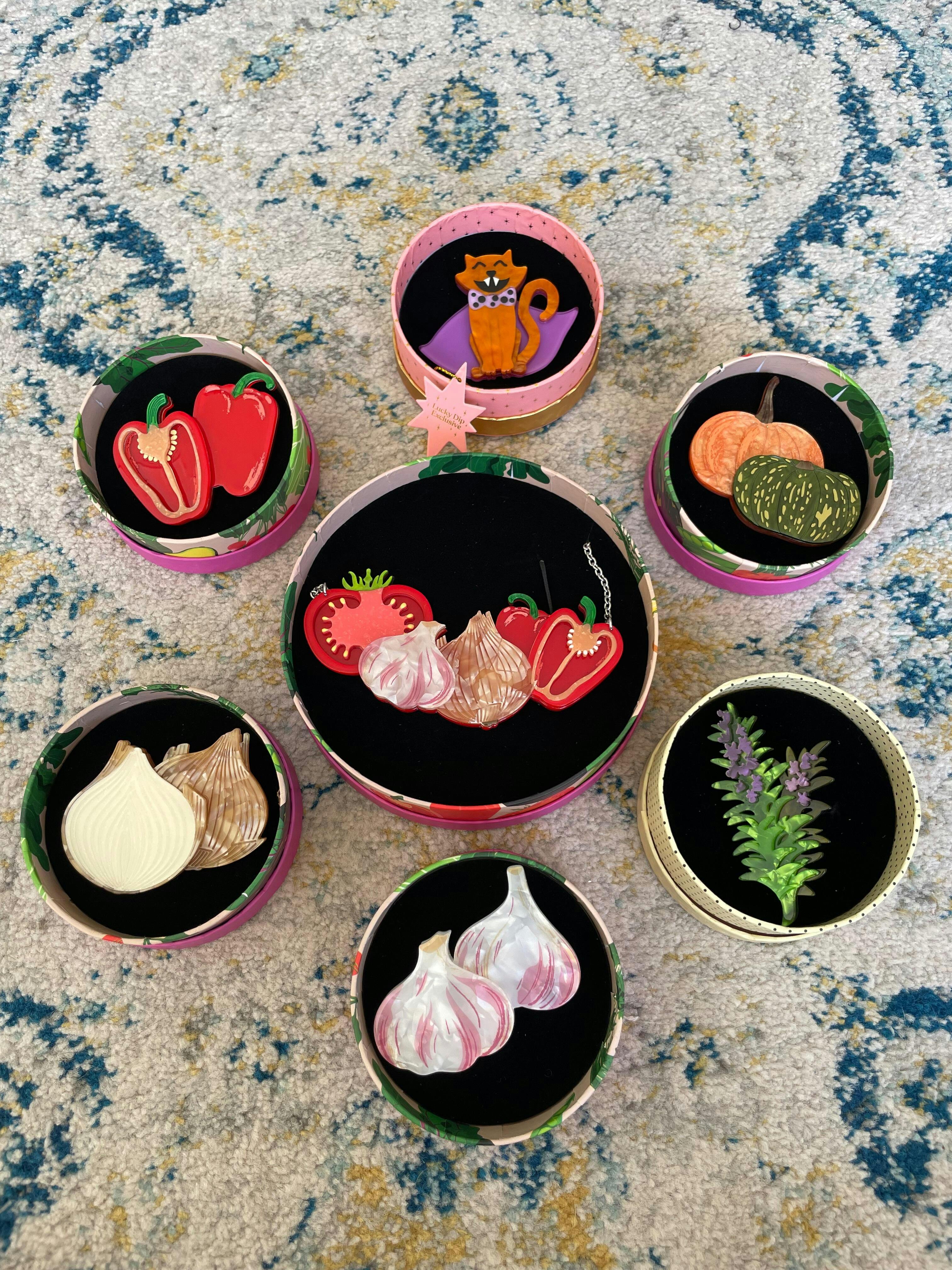 A brooch that might just bring a tear to your eye, but don’t worry, it’s the good kind! This layered beauty is part of the In Praise of Veg collection, a piece of limited-run wearable art created in celebration of Alice Zaslavsky’s award-winning cookbook and the veg that brings depth to every dish (and outfit).