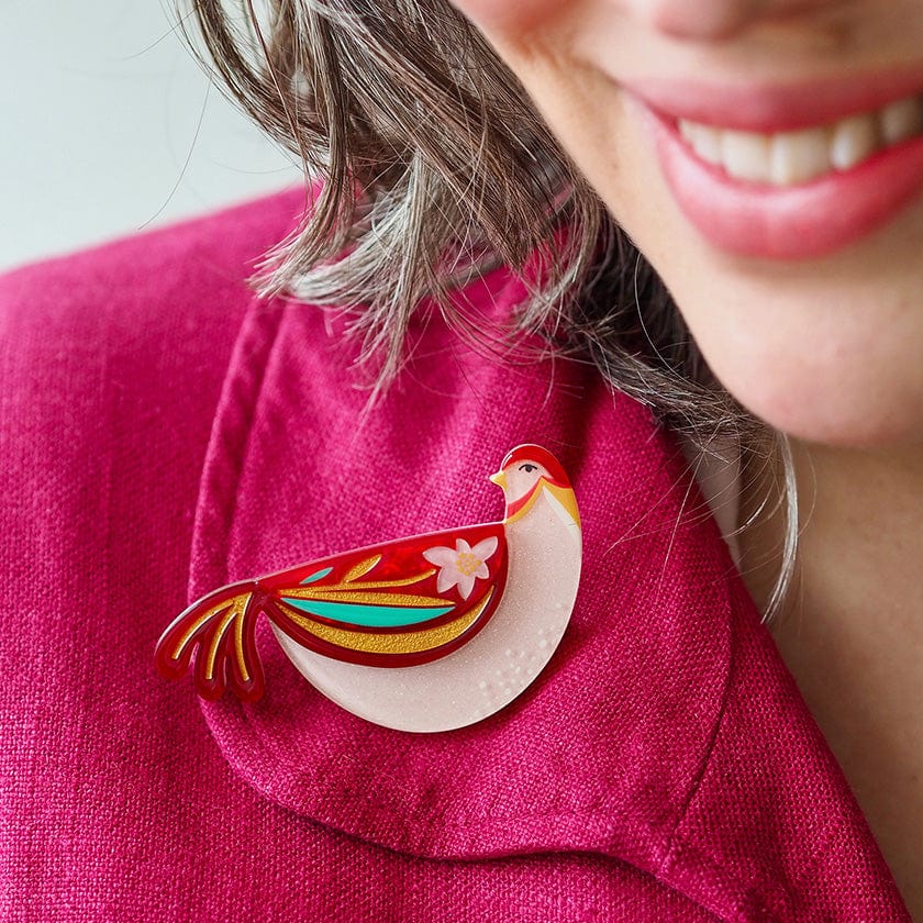 Presenting the limited-run 'Partridge Perfection' Brooch! Part of the Merry Kitschmas release created in collaboration with US-based illustrator Kenzie Kae Elston aka Snippets of Whimsy, this design has been hand-assembled from layered resin and completed with etched, painted and printed detailing. It's the perfect accessory for lovers of birds and Christmas carols alike! Also available as hair clips, an enamel pin, and statement tree ornament, while stocks last.