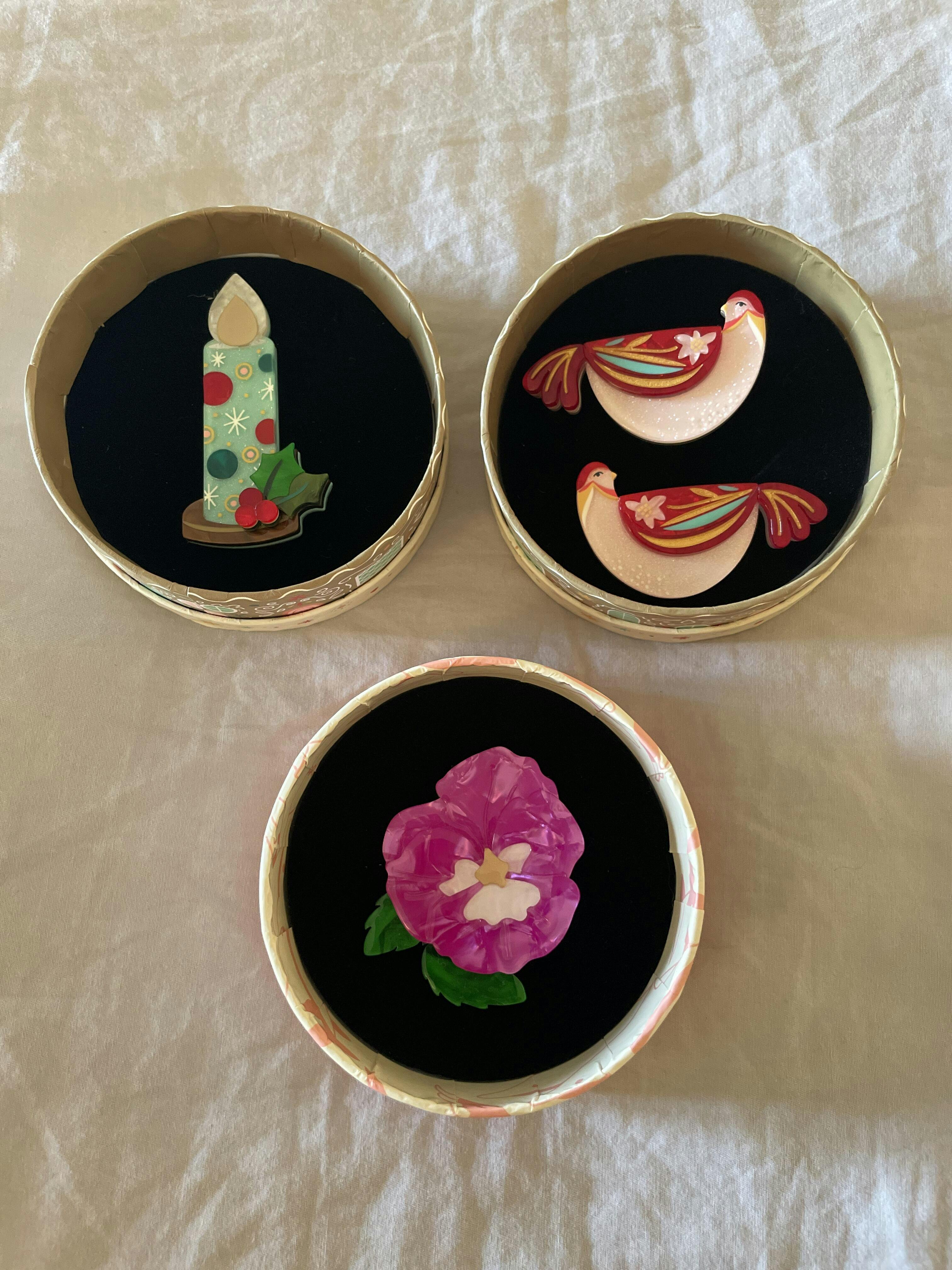 Presenting the limited-run 'Partridge Perfection' Hair Clip Set! Part of the Merry Kitschmas release created in collaboration with US-based illustrator Kenzie Kae Elston aka Snippets of Whimsy, this design has been hand-assembled from layered resin and completed with etched, painted and printed detailing. It's the perfect accessory for lovers of birds and Christmas carols alike! Also available as a brooch, an enamel pin, and statement tree ornament, while stocks last.