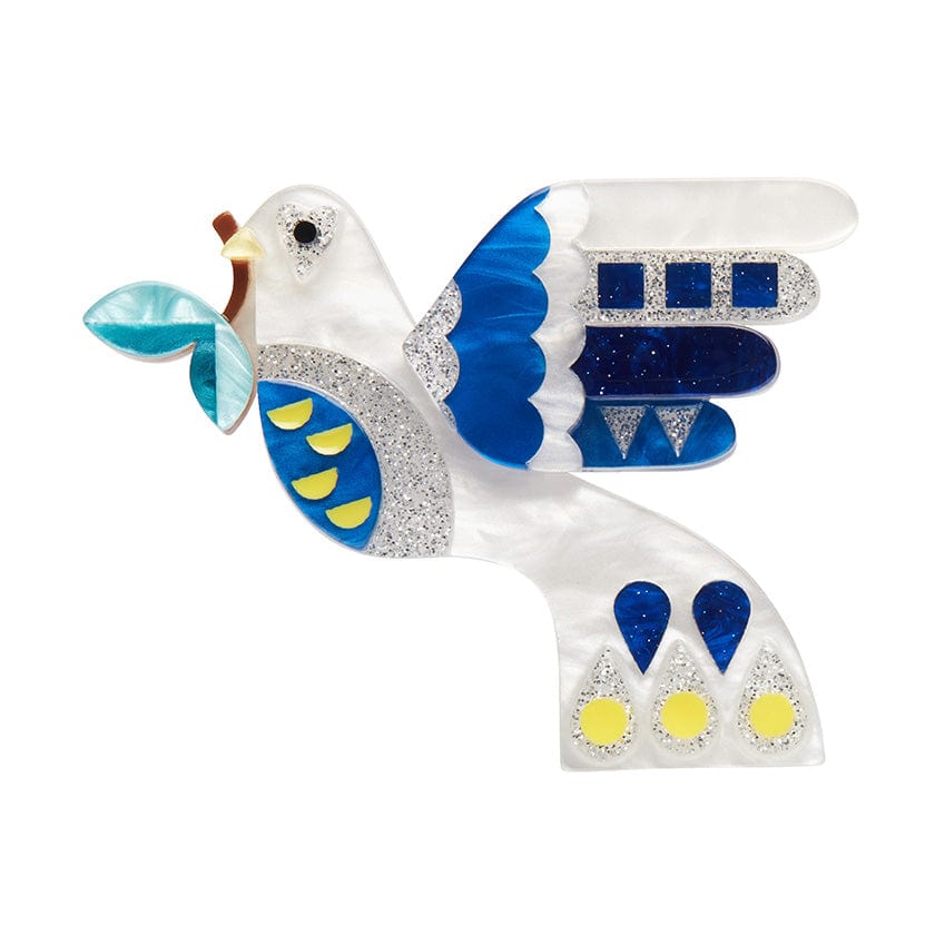 A symbol of peace and of love, we introduce our snow white dove. Hand-assembled from a mix of colourful textured resins with inset pieces and hand painted detailing, this mid-century inspired dove brooch from the Modern Holiday accessories collection will perch perfectly on any outfit, festive or otherwise. Love this design? You'll also discover it available as resin earrings, a resin necklace, an enamel pin, and an enamel tree ornament.