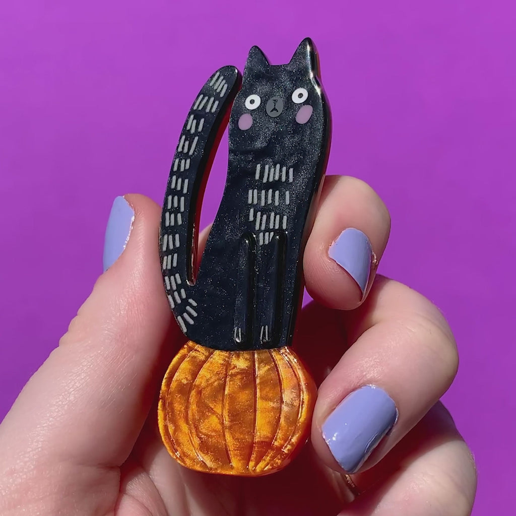 This Erstwilder x Terry Runyan Halloween-themed cat brooch has been hand-assembled from textured resins. With a combination of hand-painted, printed and laser-etched details adding just the right amount of quirky character to this wearable art accessory, Pumpkin Time Kitty, despite her reputation, is an excelllent All Hallows omen.