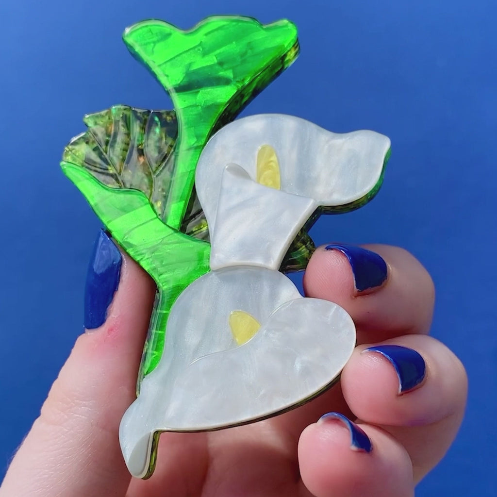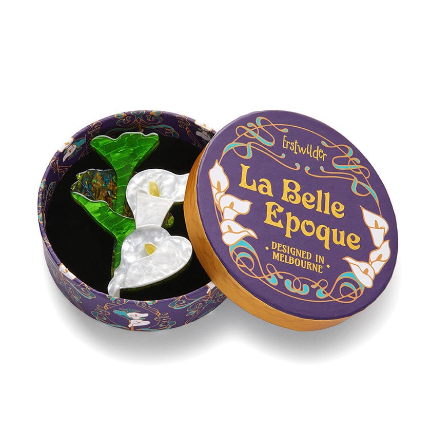 Add a touch of elegance to any outfit with this Lily flower brooch from the La Belle Époque collection. Crafted from superior textured resins and finished by hand, this piece showcases the asymmetrical beauty of the Art Nouveau movement, making wearable art a reality.