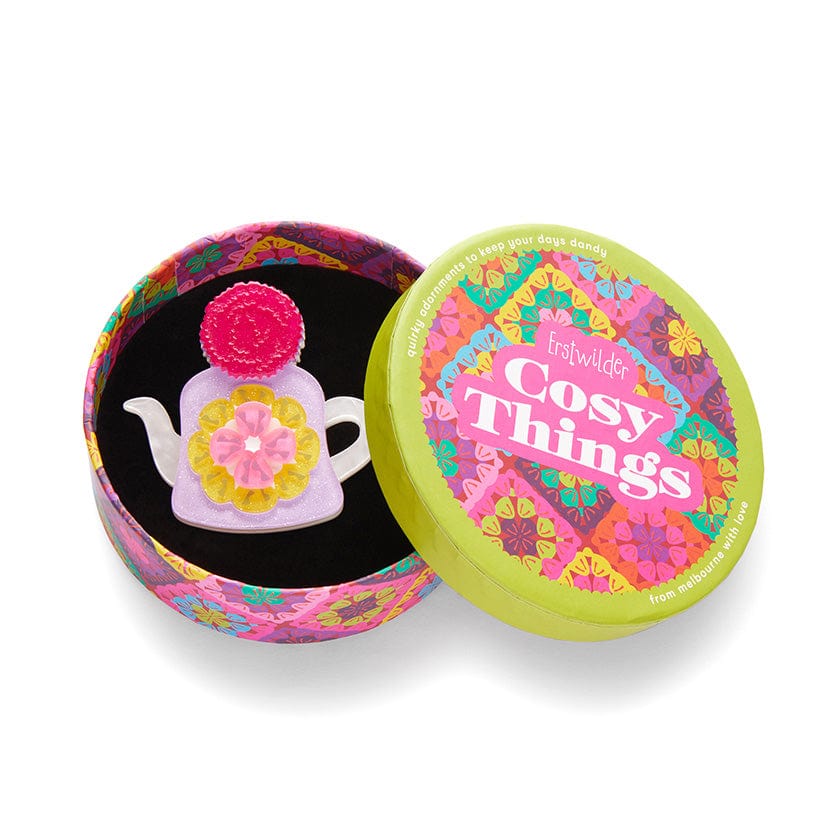 Nanna's knitting hobby has been turned into wearable resin art with this crochet tea cosy brooch from our Cosy Things collection. Hand-assembled from colourful resin, with laser-etched details and classic Erstwilder charm, Short, Stout and Cosy is as comforting on your clothes as a warm cup of tea in your hands and even has a matching enamel pin.