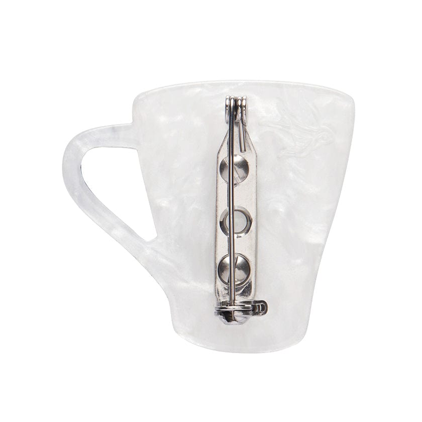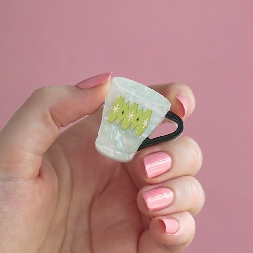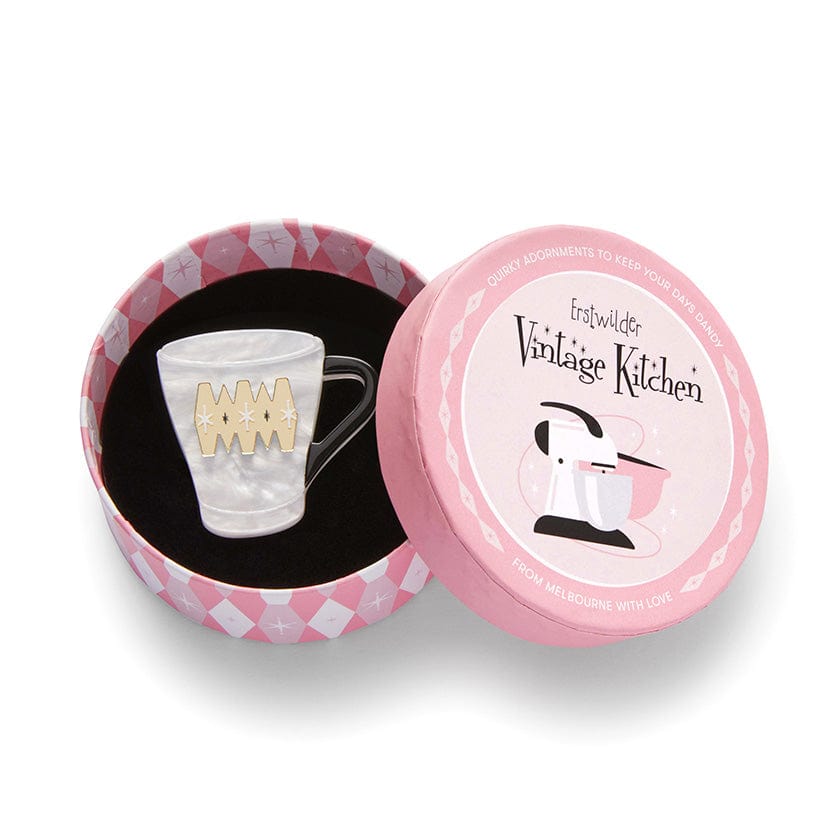 Step back into the heart of the home with this nostalgia-inducing glass atomic coffee cup mini brooch, part of the second Vintage Kitchen release. Hand-assembled from resin and finished with a combination of printing, epoxy and etching, this retro-future Wake Up and Smell the Coffee design can be worn alongside our complementary glass atomic coffee pot brooch.