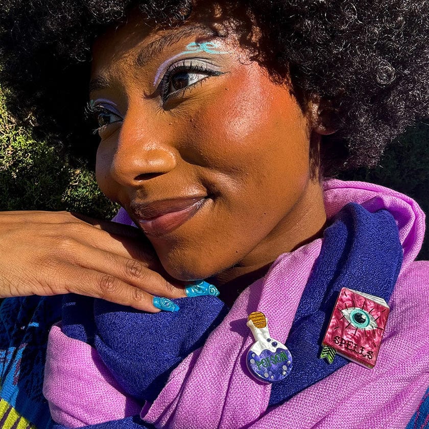 Originally released as part of our 2018 'A Haunting We Will Go' collection, this 2024 edition of the Witch's Brew mini brooch set has been hand-assembled from textured resins and brought to spooky life through a combination of hand-painted, printed and laser-etched details. With an eye for mischief and a wicked concoction at the ready, this design is perfect for Halloween.